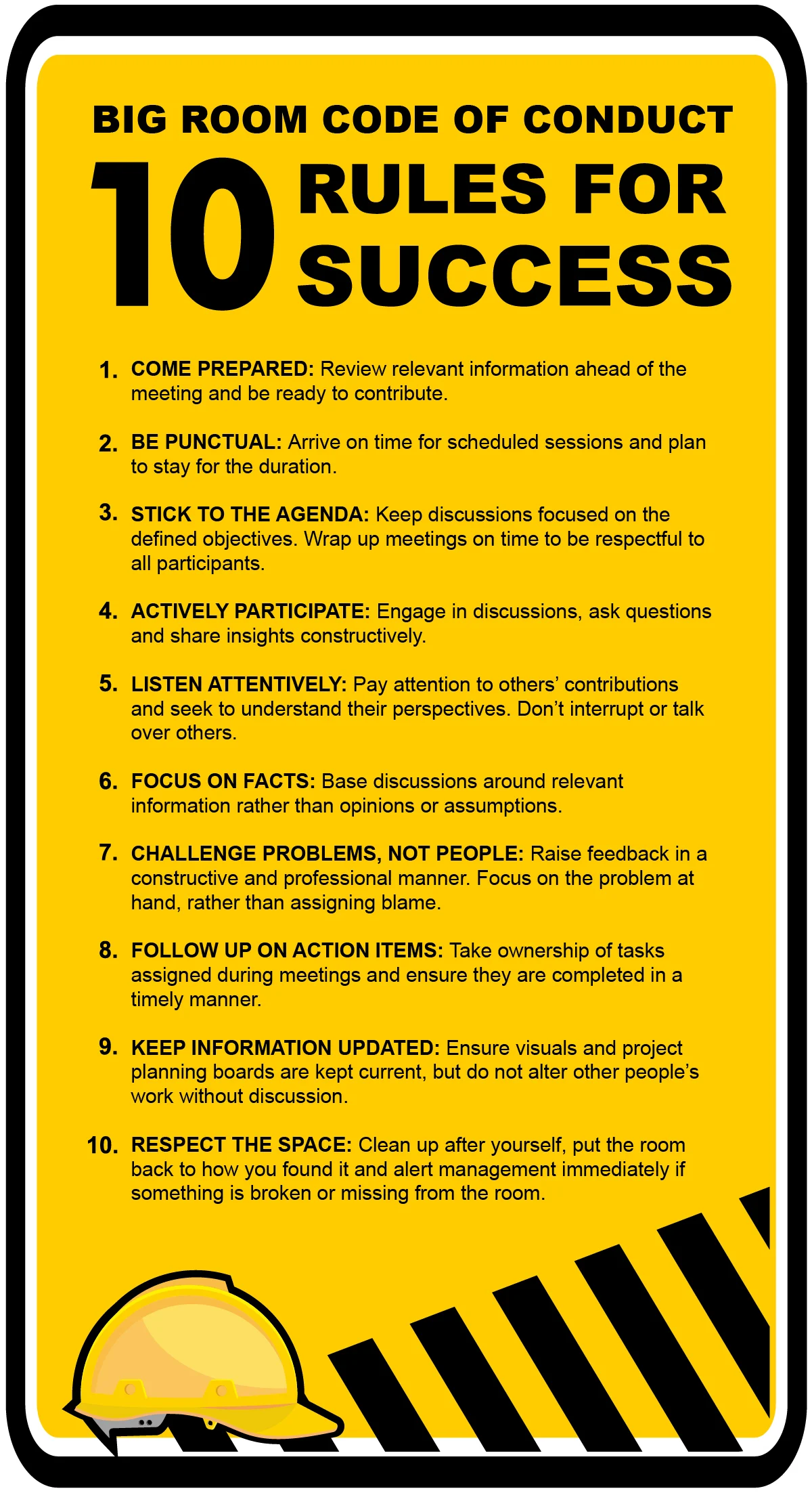In a Big Room environment, ground rules are important for maintaining order and respect. Establish a code of conduct for the space and post it in a visible location for everyone to see.